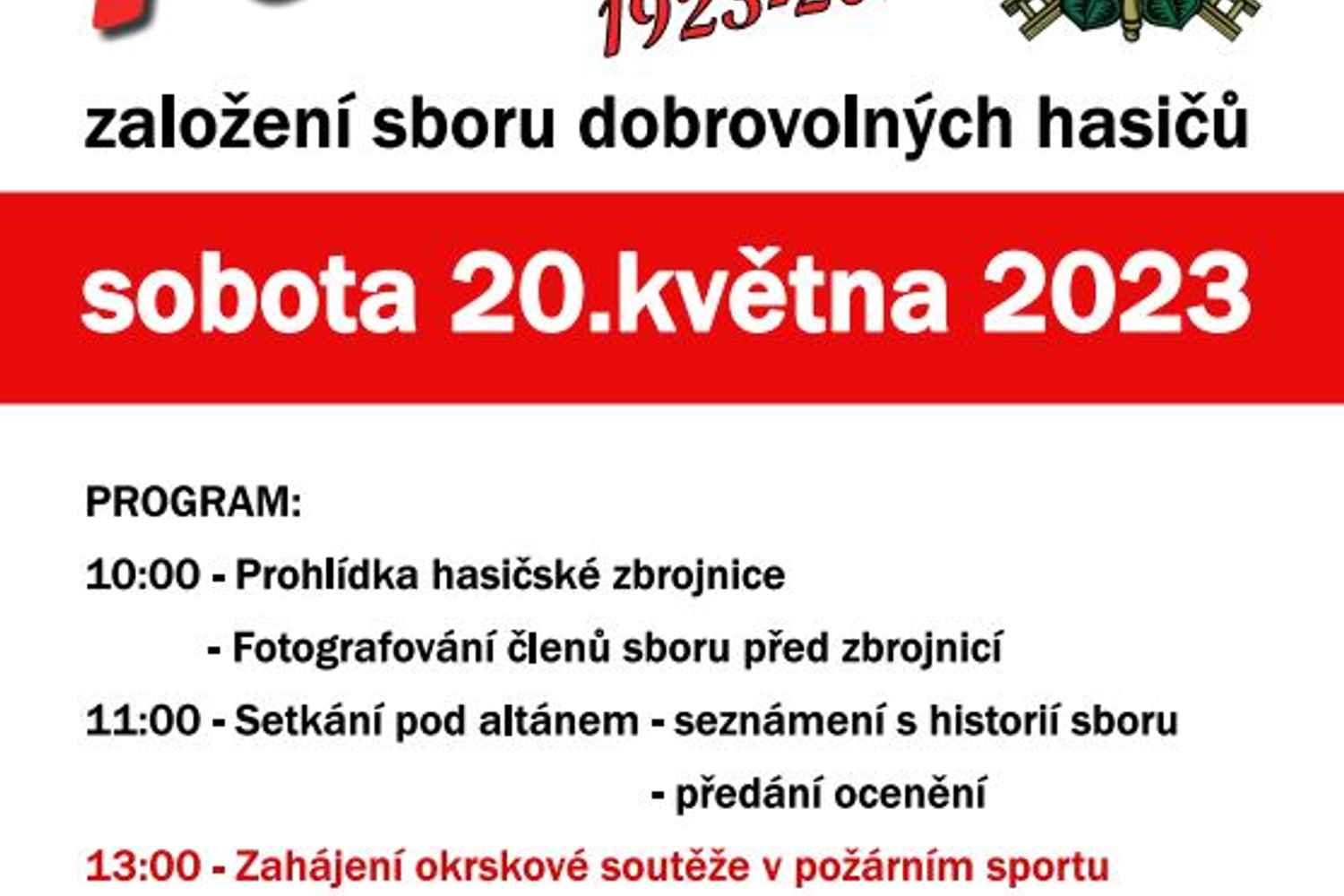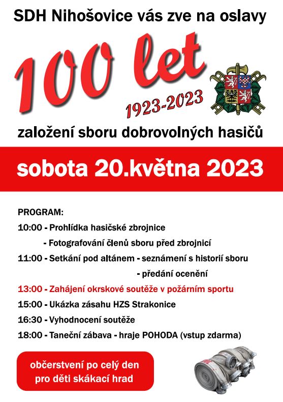 Oslavy 100 let SDH 20. 4. 2023 Zpět Sdílejte článek: Sdílet na Facebook Sdílet na Facebook V sobotu 20.5.2023 se uskuteční oslavy 100 let založení sboru dobrovolných hasičů v Nihošovicích. Program oslav startuje od 10 hod - od 13 hod okrsková soutěž - od 18 hod taneční zábava. Srdečně zveme všechny občany.